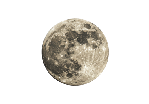 Detailed textured lunar surface with visible craters, rocky terrain, and illuminated full moon phase, astronomy and space science concept isolated on white background