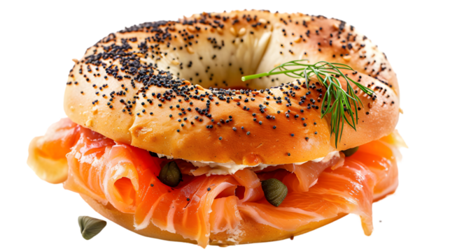 A close-up of a lox bagel with smoked salmon, capers, dill, and cream cheese, transparent background
