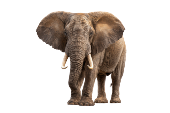 Majestic African elephant walking forward towards the camera, a powerful and traditional symbol of the wild, isolated on a clean white background