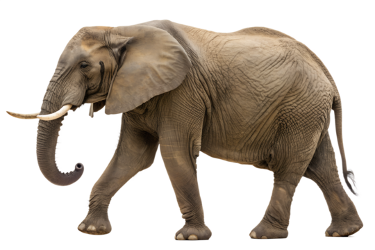 Majestic African elephant with impressive tusks captured in a full-length side profile while walking, isolated on a clean white studio background for wildlife concepts