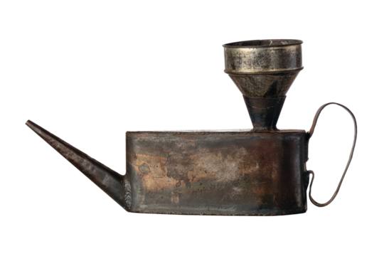 Old vintage rusty oil can isolated on white background