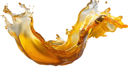 Golden-yellow oil splash in mid-air with fluid motion, thick and glossy texture, isolated on transparent background