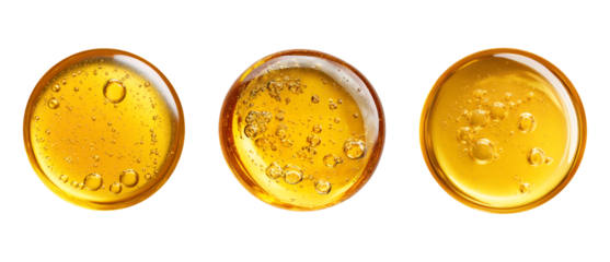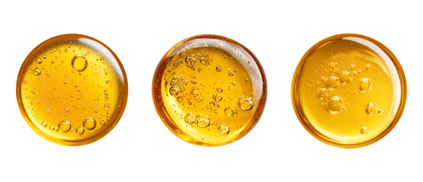 Set of Macro Shot of Golden Viscous Oil or Serum Droplet with Bubbles isolated on transparent background
