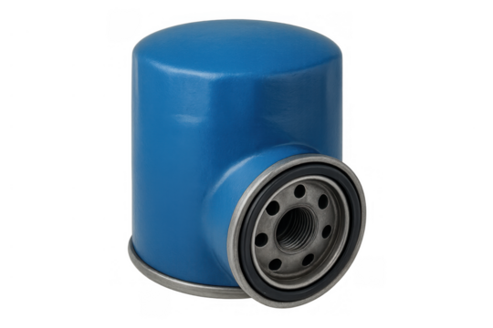 Blue automotive oil filter providing engine lubrication and filtration capability on a transparent background