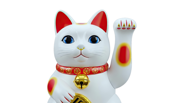 A lucky Maneki-neko figurine, glossy ceramic white cat with golden bell and red bib, paw raised, smiling face, isolated on transparent background