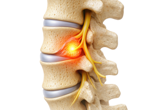 Lumbar spine disc herniation compressing spinal nerve causing lower back pain medical anatomy isolated on white background