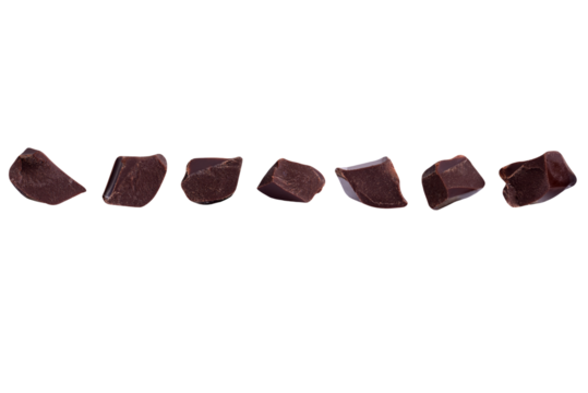 Chocolate broken into pieces with brown sweet candy bar chunks showing tasty dessert food detail isolated on white background