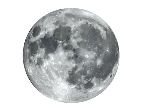 A detailed, close-up view of the full moon showcasing its heavily cratered surface and distinct lunar features against a solid background. background removed