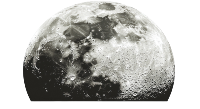 Half moon isolated on transparent background, detailed lunar surface with craters and shadows, astronomical object in PNG format