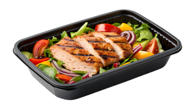 closeup of grilled meat and vegetables salad in black plastic lunch box isolated on white. breakfast dinner food meal, cuisine snack nutrition container, tasty restaurant dish, delivery 70003818 1