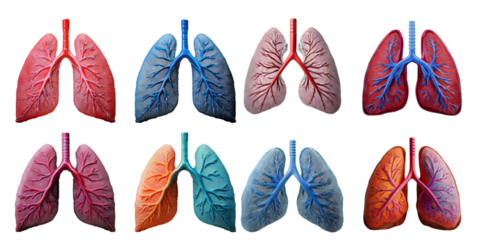 Colorful medical illustrations of human lungs in various styles, isolated on transparent background