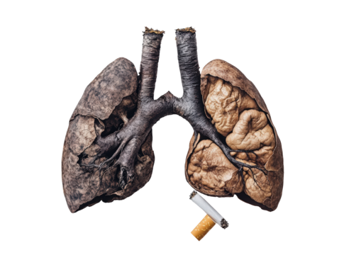Artistic representation of human lungs with smoke and fire elements, highlighting the impact of pollution.