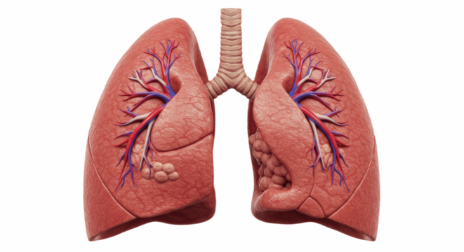detailed human lungs isolated on white background, depicting anatomy, respiratory system, and medical education in a realistic biological illustration style