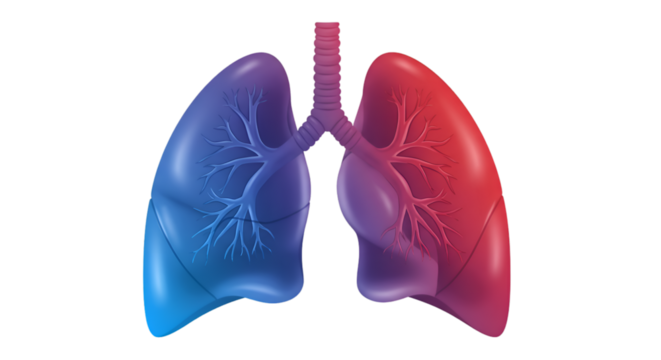 Anatomical illustration of the human respiratory system, featuring lungs with a blue and red color gradient.