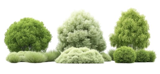 A trio of lush green trees standing in a row. foliage against a clean white background. ideal for nature-themed projects or environmental conservation materials