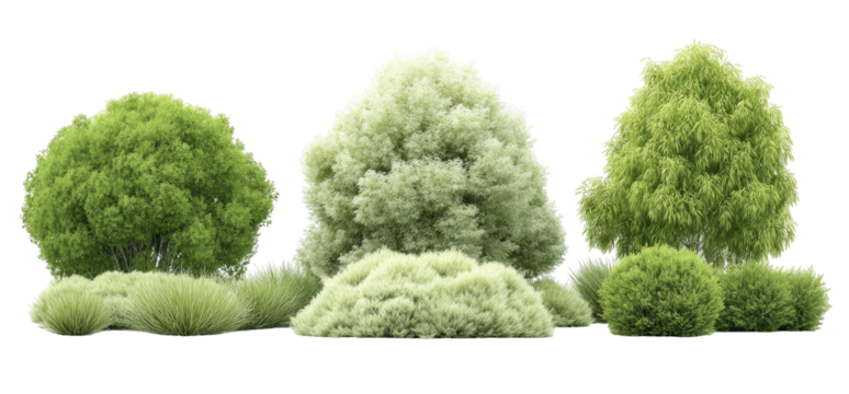 Collection of green leafy bushes from a top down perspective isolated on transparent background. Top view collection of lush green trees isolated on white background.
