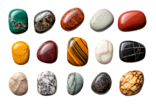 Collection of polished stones in various colors and patterns on a white isolated background.