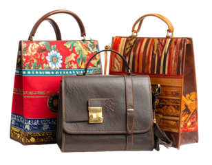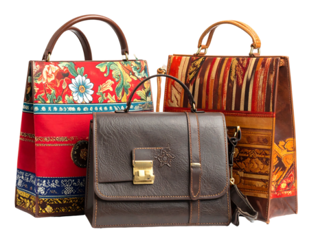 Three diverse satchels a floral tote, striped bag, and leather messenger. Dark backdrop highlights the artisanal craftsmanship
