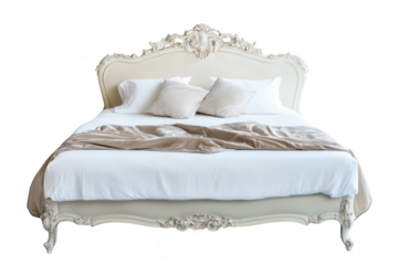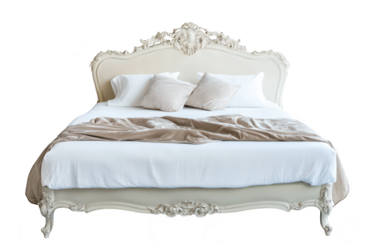 Elegant vintage bed with ornate headboard and soft bedding. a luxurious bedroom setting. perfect for home decor inspiration or interior design projects