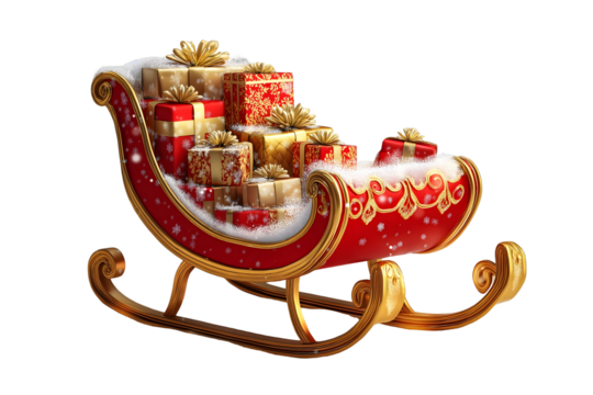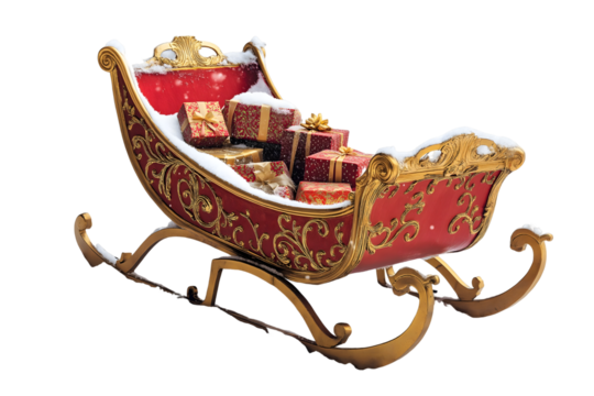 Elegant silver metallic sleigh with ornate scrollwork and curved runners, isolated on a transparent background