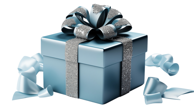 A luxurious blue gift box with a shimmering silver ribbon, ideal for gifting, isolated on transparent background.