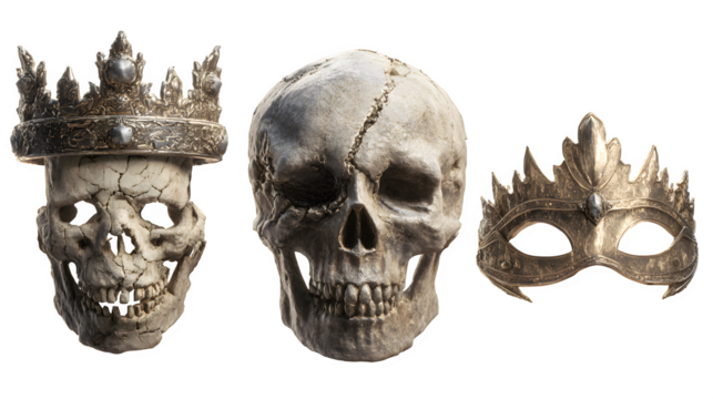 Gilded human skull resting against transparent backdrop, symbolizing mortality, opulence, luxury aesthetic