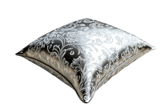 An ornate silver throw pillow radiates luxury inviting restful dreams with shimmering floral on transparent background