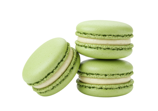 Stack of three green pistachio macarons isolated PNG, delicious French almond meringue-based confection on transparent background