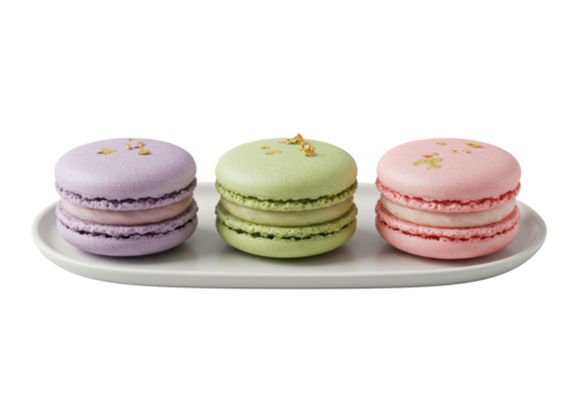 Three pastel lavender, pistachio, and rose gourmet macarons with gold flakes, arranged on a matte white ceramic plate against a transparent studio background, isolated effect, perfect dessert
