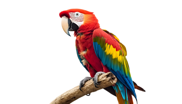 Colorful macaw parrot with vibrant feathers isolated on transparent background, ideal for tropical and exotic design projects