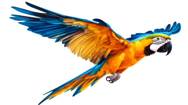 Isolated Macaw parrot flying with open wings, gold and blue bird with strong, curved beak