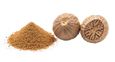 Nutmeg spice whole and sliced, top view isolated PNG with Transparent Background