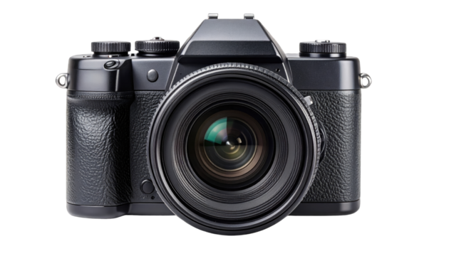 A black digital camera with a lens facing forward on a white background