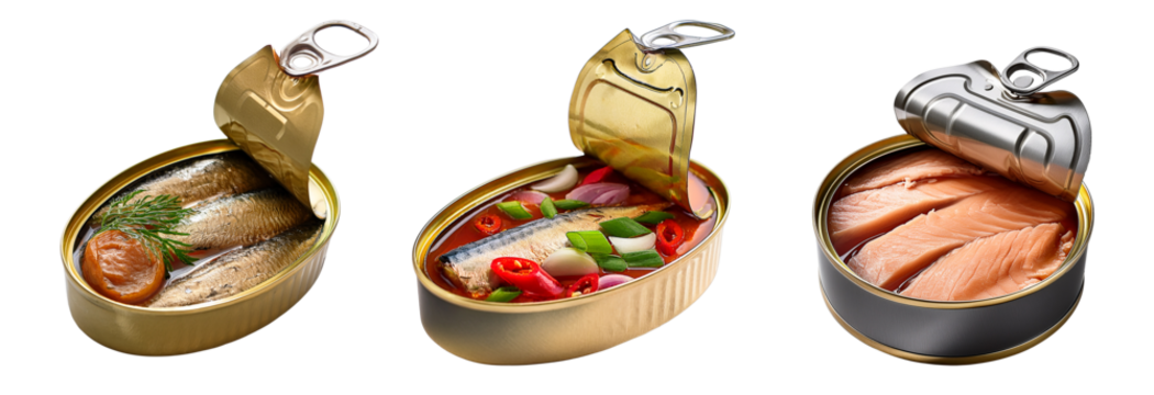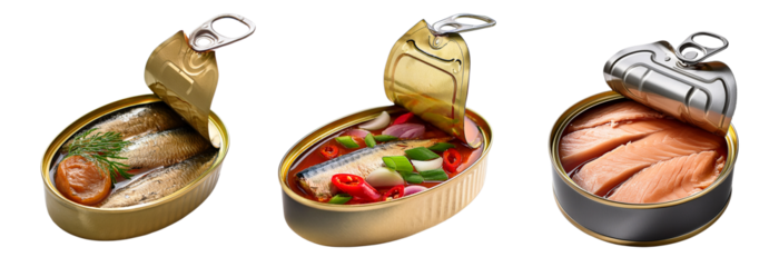 Tinned Fish Trio: A studio shot of three opened tins of fish, showcasing the appetizing contents within, offering a glimpse into culinary variety.