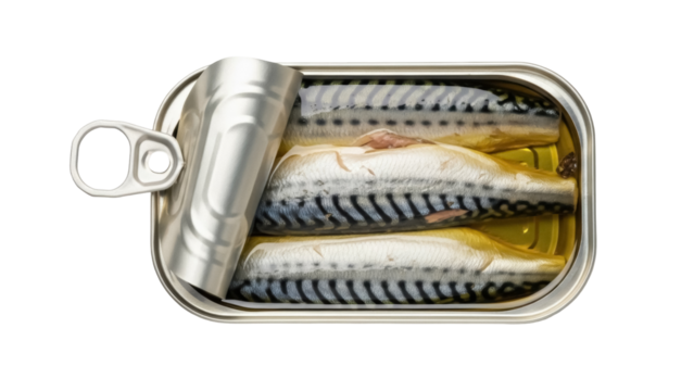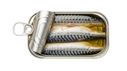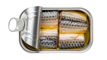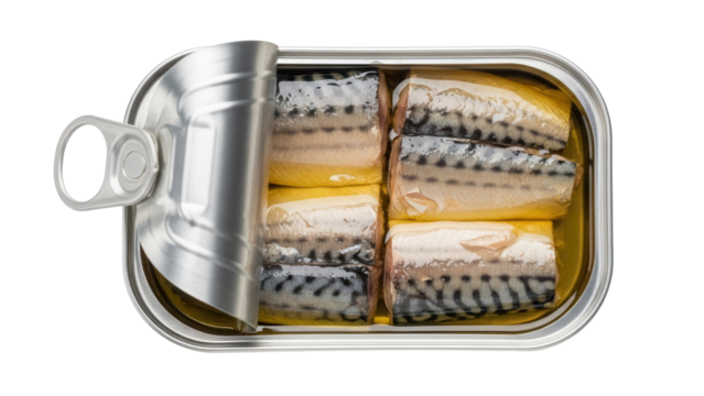 Canned mackerel in oil PNG isolated, open tin of fish fillets on transparent background, seafood delicacy for healthy eating