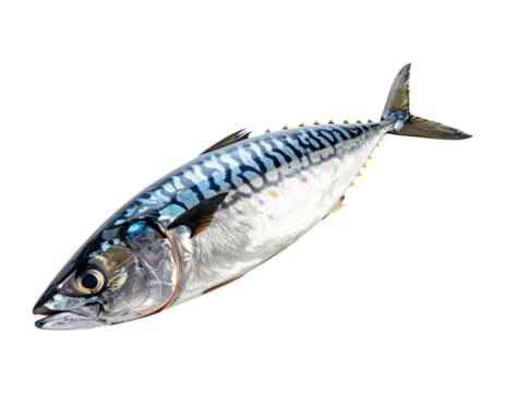 Fresh mackerel fish with detailed scales and fins isolated on white transparent background. Concept of seafood and marine life