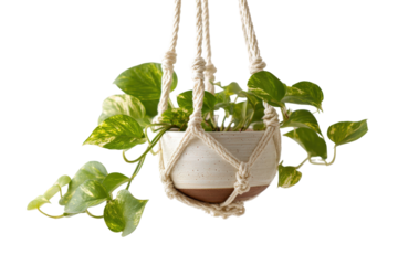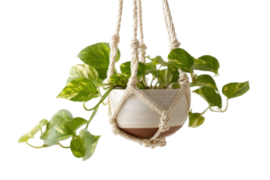Lush green pothos plant in a ceramic pot with a macrame rope hanger.
