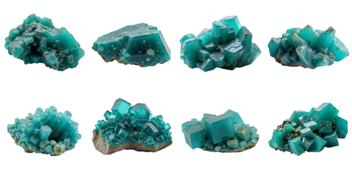 Beautiful chrysocolla minerals arranged in different shapes on an isolated background