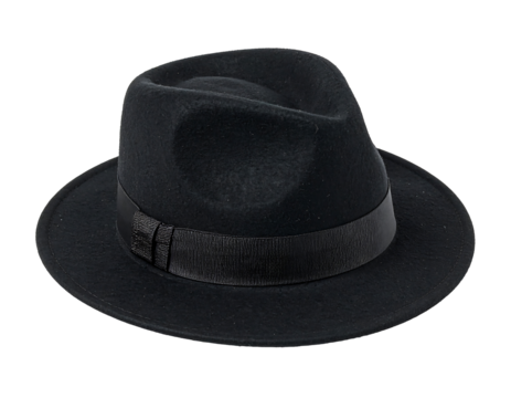 Black fedora hat, classic headwear with ribbon, vintage fashion accessory on transparent background