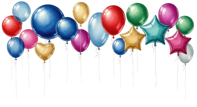 detailed watercolor illustration showing varied iridescent helium balloons in vibrant sapphire, ruby, and emerald colors floating against a transparent background, concept of joyful celebration