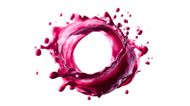 Vibrant magenta fluid splashing and forming a dynamic circular wave with suspended droplets, ideal for cosmetic product packaging, beverage advertisements, or abstract motion graphics.