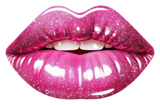 Bright pink lips cartoon with white teeth transparent background pop art style