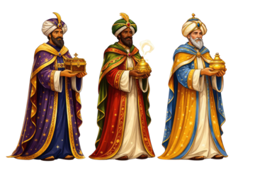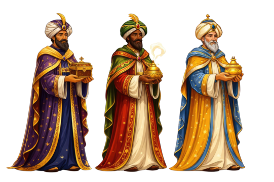Three kings day or epiphany three regal figures in colorful robes holding gifts representing the magi no background