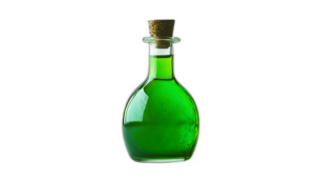 A witches potion bottle with glowing green liquid isolated on a plain white background