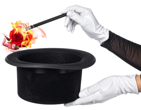 Magician s hands in white gloves holding a top hat and wand isolated on transparent background