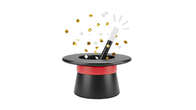 Black magic top hat and wand for magician performance equipment show trick illusionist accessory costume prop on transparent background