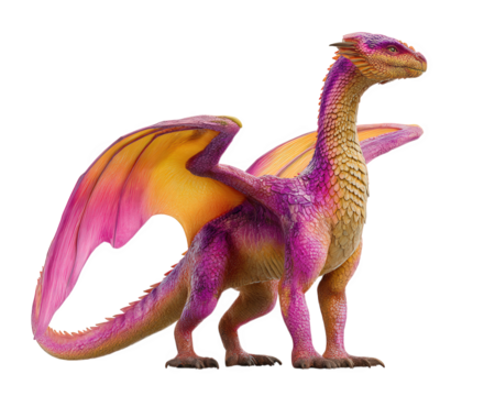 Golden bronze dragon with curved horns and spread wings in standing position, isolated on a transparent background