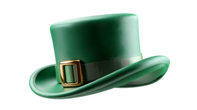 A vibrant green top hat featuring a golden buckle and a subtle textured surface, perfect for St Patricks Day celebrations, magical themes, or event promotions.