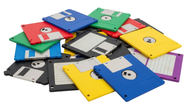 A pile of colorful floppy disks, a relic of older computer technology, stacked together.