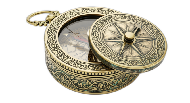 Antique brass pocket compass with ornate engraved details and open lid on transparent background